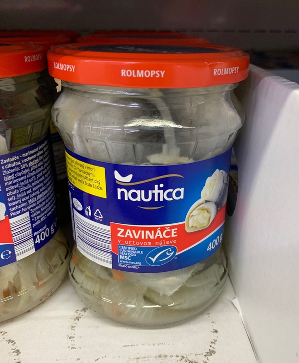 Zavináč is a rolled pickled herring dish which, if you squint, resembles the @ symbol – hence the name. Though I’d never heard of it, this same dish is called rollmop in English, which is decidedly unappetizing. In the grocery store, they look like this: