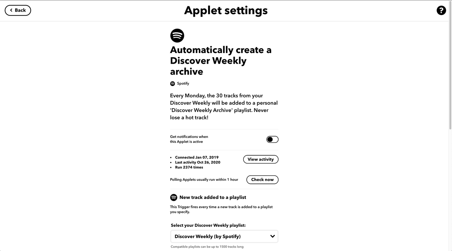 Similarly, in the past couple years IFTTT’s UI has leaned heavily into the “applet” metaphor, with these big goofy toggle switches to enable/disable automations. The site also transitioned towards a focus on community- (or, more often corporate-) created automations, at the expense of the experience for creating your own applets. Like seriously, why is 30% of the UI for an applet details page (!) taken up by the connection status toggle?