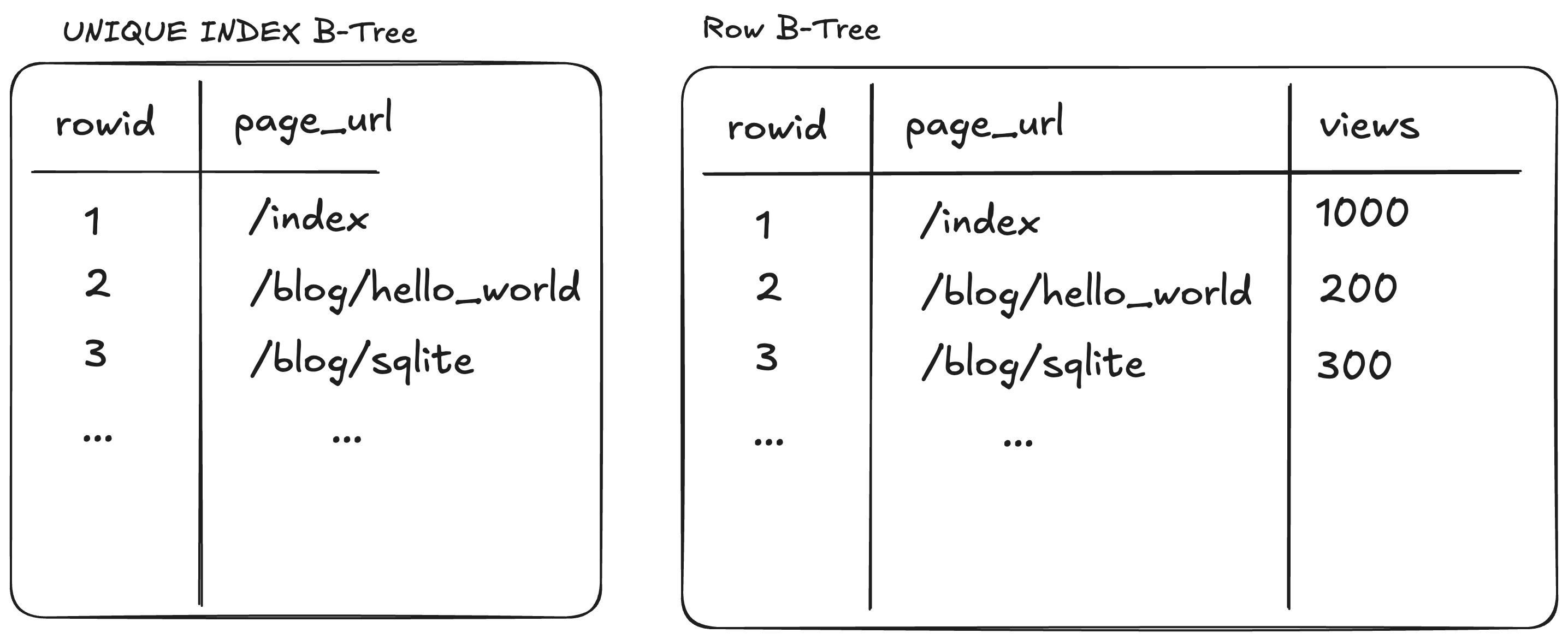 (rowid, page_url, views) and the second for the index entries of